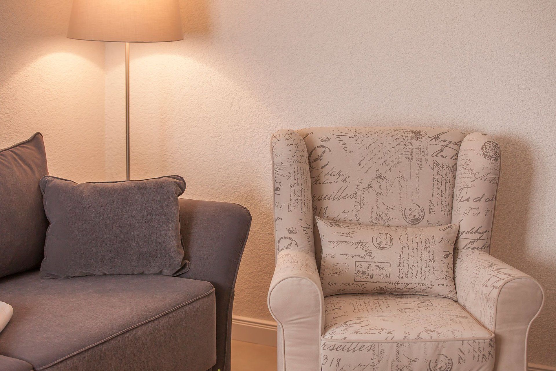 In der mittleren und oberen Etage der Villa befinden sich schön geschnittene 2-Raum-Appartements mit gemütlichen Balkonen und einer Sitzgruppe im Freien. Die Appartements besitzen ein Schlafzimmer mit einem Doppelbett und einem Flachbildfernseher. Im Wohnzimmer hat man die Möglichkeit der Aufbettung für zwei Personen, auf einem bequemen Schlafsofa. Der offene Wohnbereich besitzt neben einem bequemen Sofa, einen gemütlichen Ohrensessel, eine Wohnwand mit Flachbild-TV, Musikanlage und Blu-ray-Player. Von der Küche oder dem Wohnzimmer aus hat man direkten Zugang zu einem schönen Balkon. Hier erwarten unsere Gäste bequeme Terrassenmöbel, zum Verweilen oder Frühstücken im Freien. Die Küche ist voll ausgestattet und besitzt neben einer Spülmaschine, einen Backofen, ein Ceran Kochfeld, einen Kühlschrank mit Gefrierfach, eine Kaffeepadmaschine, einen Toaster, einen Wasserkocher und allerlei Geschirr und Kochutensilien.